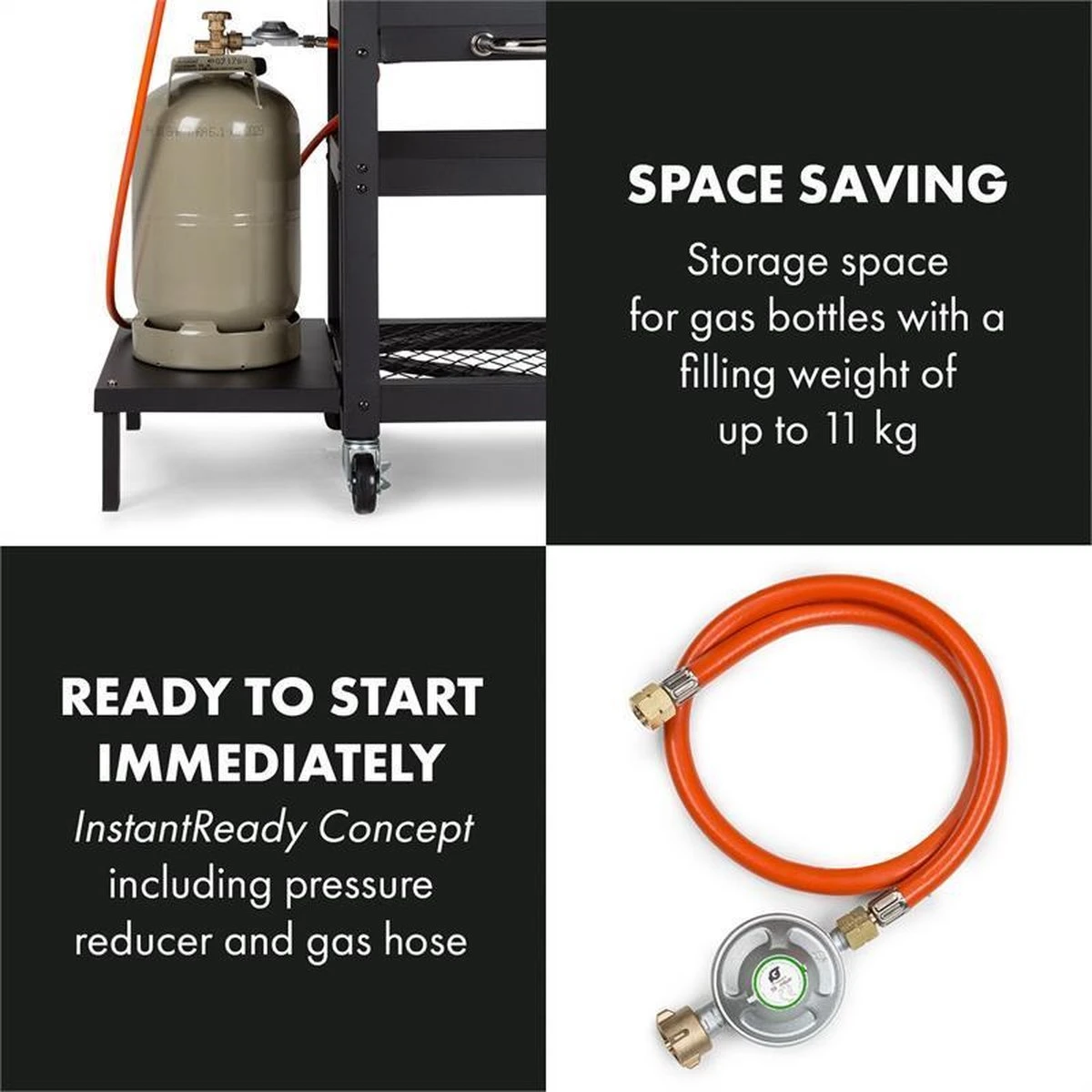 Na de aansluiting van een gasfles zorgt de piezo-ontsteker dankzij het SNAP-JET Ignition-System voor de snelle start van de brander: een druk op de draaiknop is voldoende en al meteen is gasbarbecue gebruiksklaar. De krachtige warmte van de drie hoofdbranders en een zijbrander van rvs met een totaal vermogen van 13,5 kW zorgt ervoor dat verschillende gerechten buitengewoon goed gebarbecued kunnen worden. Op de beide gietijzeren grillroosters met een enorme afmeting van elk 53 x 45 cm worden met name steaks en andere vleesspecialiteiten perfect tot in de puntjes toebereid: door de hoge temperaturen wordt het vlees van buiten krokant en van binnen zacht en mals. De hitte wordt dankzij het deksel met de dubbele wand bijzonder goed aan de binnenkant gehouden, twee thermometers geven te allen tijde informatie over de actuele temperaturen.