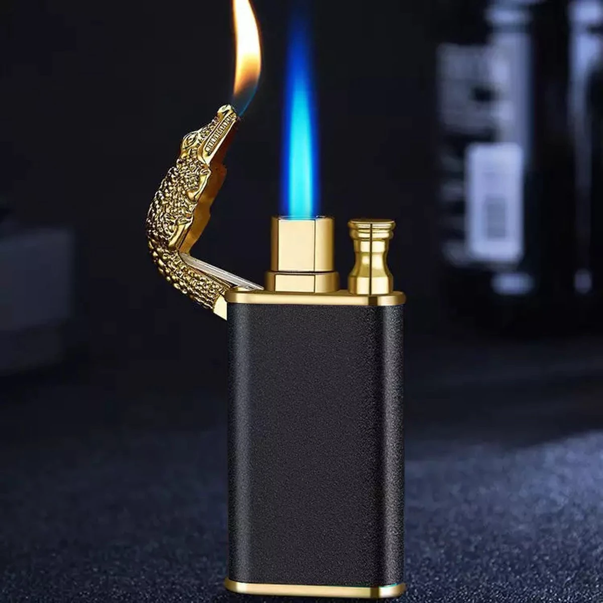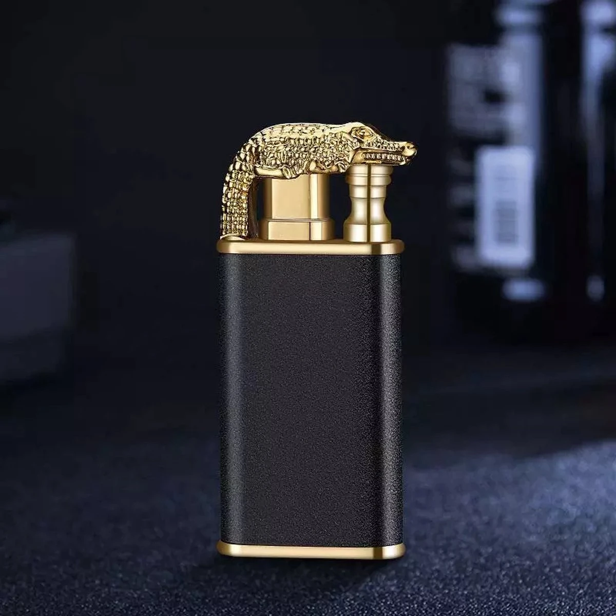 Een unieke aansteker met een krokodil op de bovenkant.